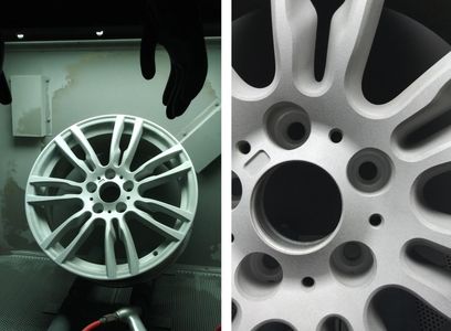 Next, we sand blast your wheels to bare metal like factory. This is a critical and very time consuming step. To properly powder coat ALL old finish has to be removed plus the leaves a profile or texture that gives the powder something to "bite" onto for better adhesion and greater durability. We will send pictures of this process so you know it is being done the right way!