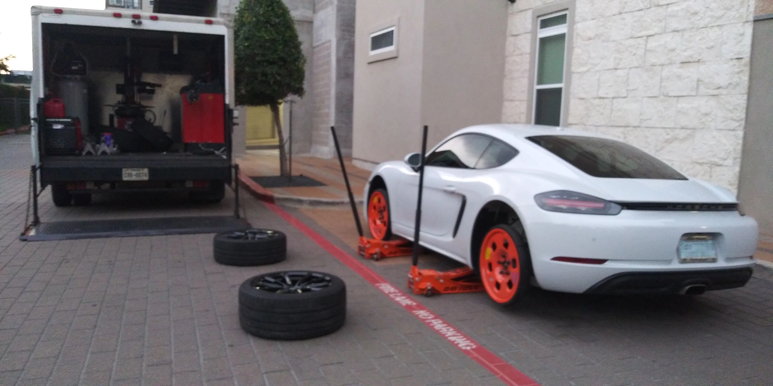 We come out to your location and swap out your wheels with our special safety wheels. These wheels are not to be driving on but are used in place of jack stands. Safety is our first, second, and third concern! With our special wheels there is zero chance of the vehicle falling like with traditional jack stands. Peace of mind.